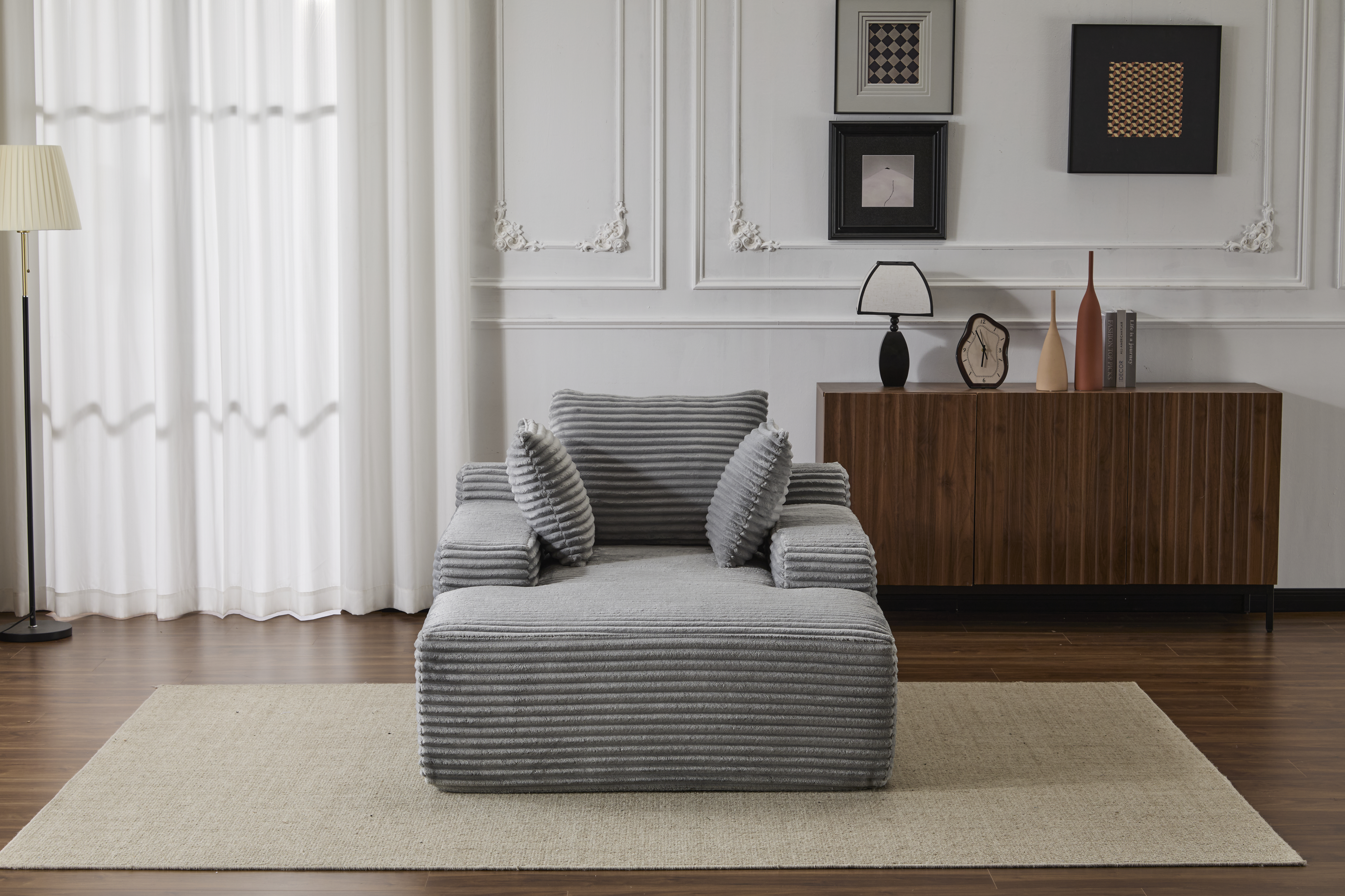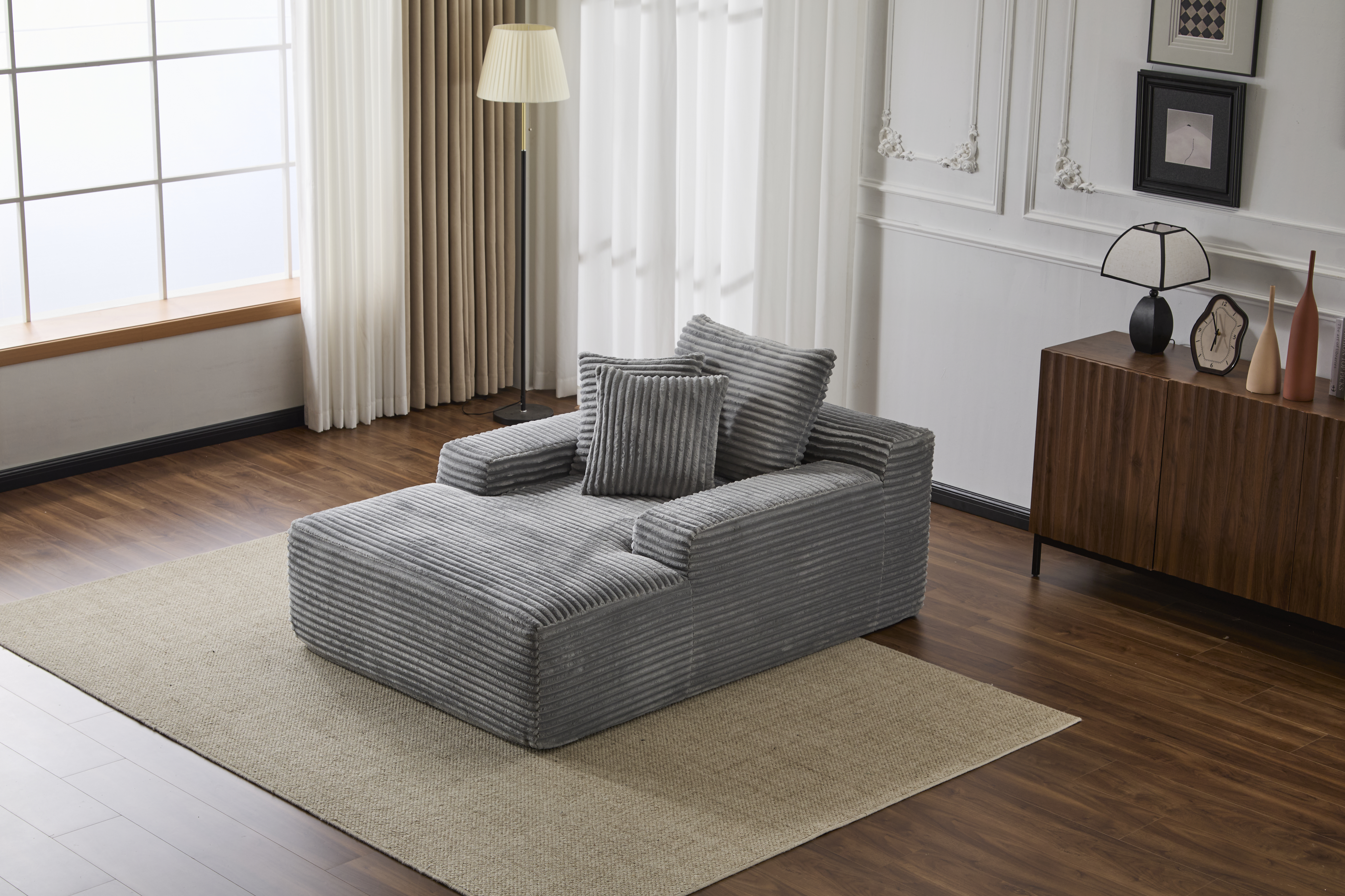 Product Name:Oversized Chaise Lounge Chair Cozy Cloud Couch, Modern Plush Corduroy Upholstered Sleeper Sofa Daybed with 3 Throw Pillows and Wide Armrest for Living Room, No Assembly Required,Grey